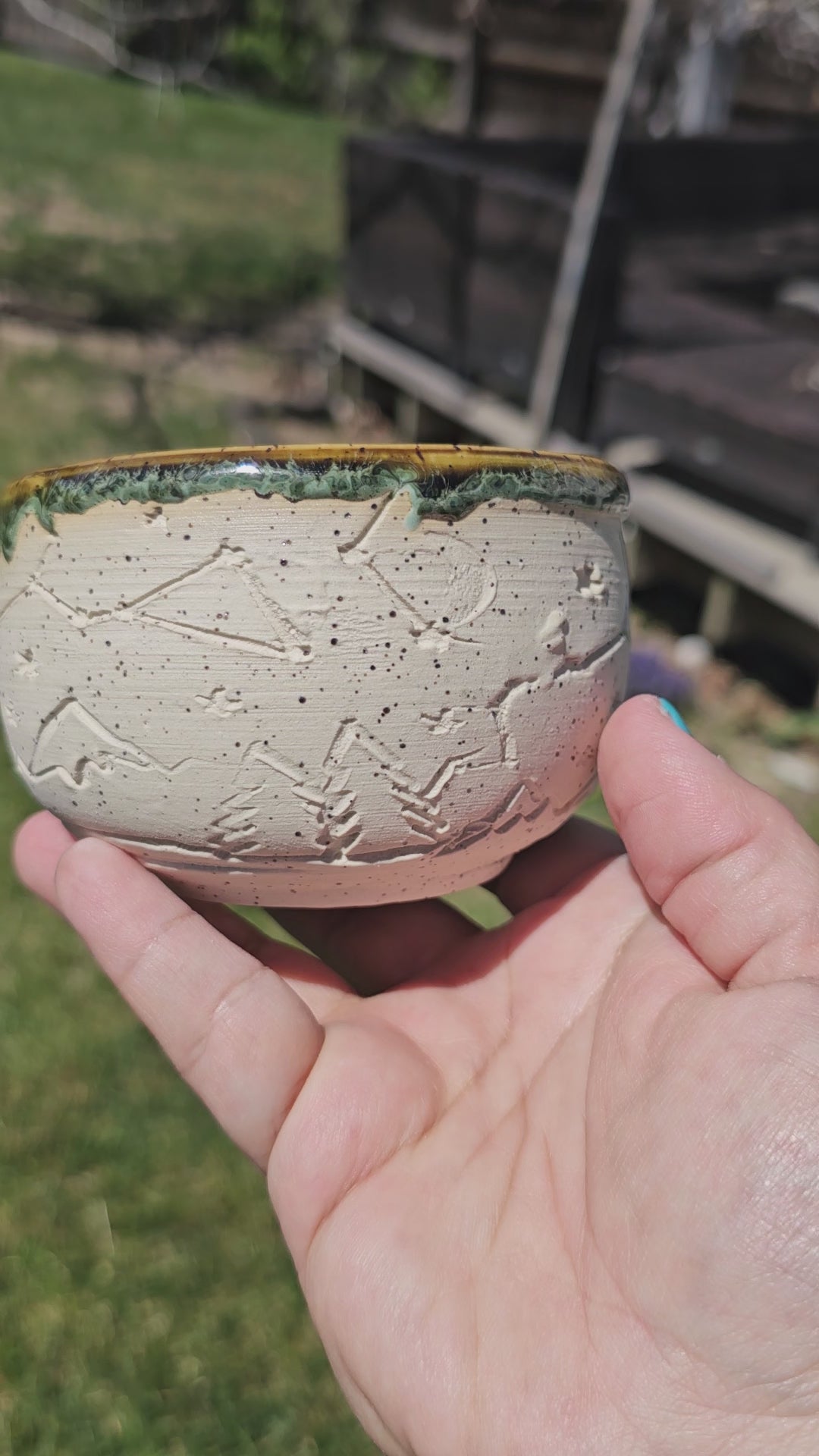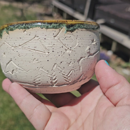 Tiny but mighty, this one-of-a-kind mini bowl brings the cosmos down to earth. Hand-printed with majestic mountains and twinkling constellations, it's the perfect vessel for your morning oatmeal, yogurt, or favorite dips. The cheerful green interior adds a pop of color to your table, while the speckled texture gives it rustic charm. Small enough to feel special, big enough to matter.