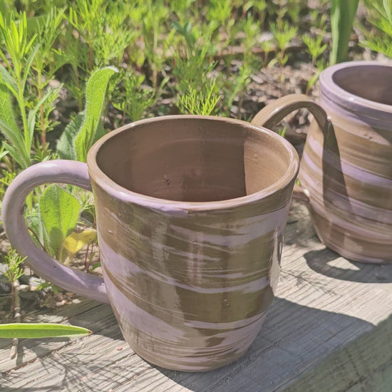 "Add some whimsy to your morning routine with this handcrafted olive green and purple marbled mug. Each one-of-a-kind design brings a unique touch to your daily cup of coffee, making it the perfect addition to your kitchen. Start your day off with a smile! (Limited edition, so grab it before it's gone!)"